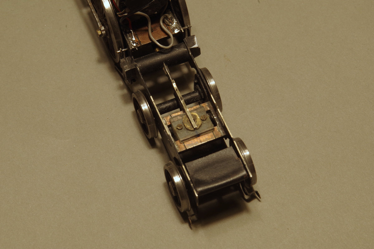 The bogie frames can rotate, and move up and down, whilst the two axles can move independently, supported by a central beam, as shown in the photo left. The bogie can also move from side-to side with centring provided by the compensation beam (shown in the photo right). This particular feature was incorporated to ensure adequate horizontal flexibility to enable the loco to traverse tight-ish curves. However, it has proved to be an unnecessary complication, and I won’t repeat it again when (if) I get around building an I2 or H. My other bogie engines (B4 and D3) are equipped with a simple pivot for the bogie, and these quite happily negotiate B6 turnouts.