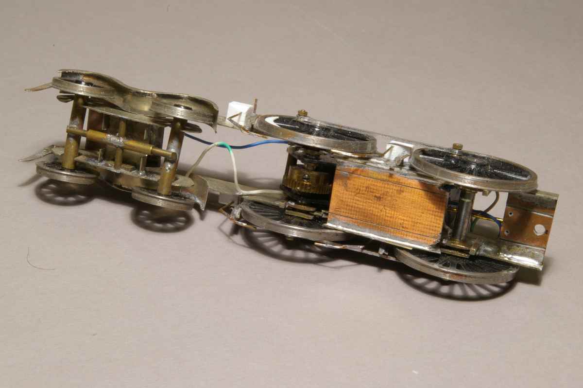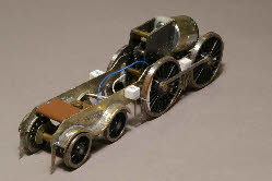 Pick up uses split axles as usual, but just on the driving axles. The pick-up wires are soldered to the axle bearings on the driving wheels, but in this photo have not yet been soldered to the side frames.