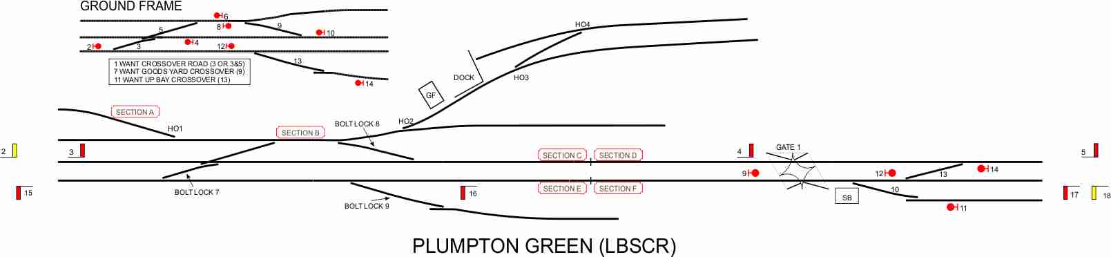 Left - the final signal diagram, showing the two added components from the real thing - the brickworks siding (top left) and the bay platform (bottom), both added to give a little more operational interest to the model. The main diagram shows lever numbers for the signal cabin, and the inset shows the levers for the ground frame.
