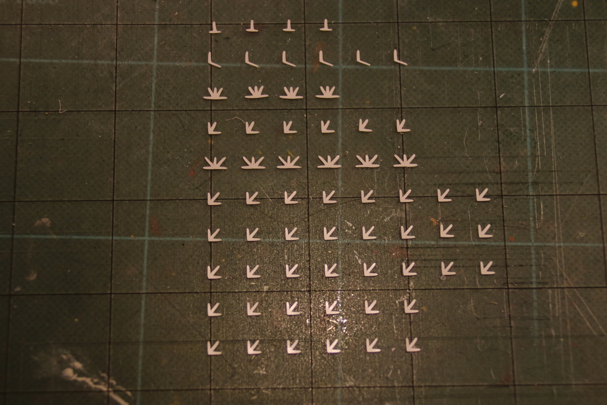 Some 30 years later, I hit on the idea idea of using my Silhouette cutter to do the job for me. Rather than glueing on tiny squares of plastic to represent the bolts, I pricked the back of each washer plate with a sharp point to create a small dome in the 5 thou plasticard. The photos show the half-finished body, and the washer plates.