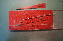 For point-work, instead of gluing nickel-silver strips to the sleepers under the ‘V’, I have made some nickel-silver strips (similar to the Bill Bedford slide chairs described above) with a hole drilled through in an appropriate place, so that they can be soldered over a rivet, providing a more secure fixing than just gluing, as shown in the photo right.