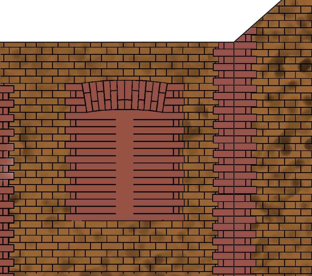 The next bit is to add the brickwork pattern - i.e. the mortar outline. This is done in a similar way to adding the brickwork colour, by cutting and pasting four separate bits, each large enough to just cover one wall. When you first paste these onto your drawing, they will obscure the outline of the building, and the background brick colour. Don't worry if at this stage the horizontal mortar courses don't line up - that gets fixed later. Figure 4a shows three out of four panels pasted in.