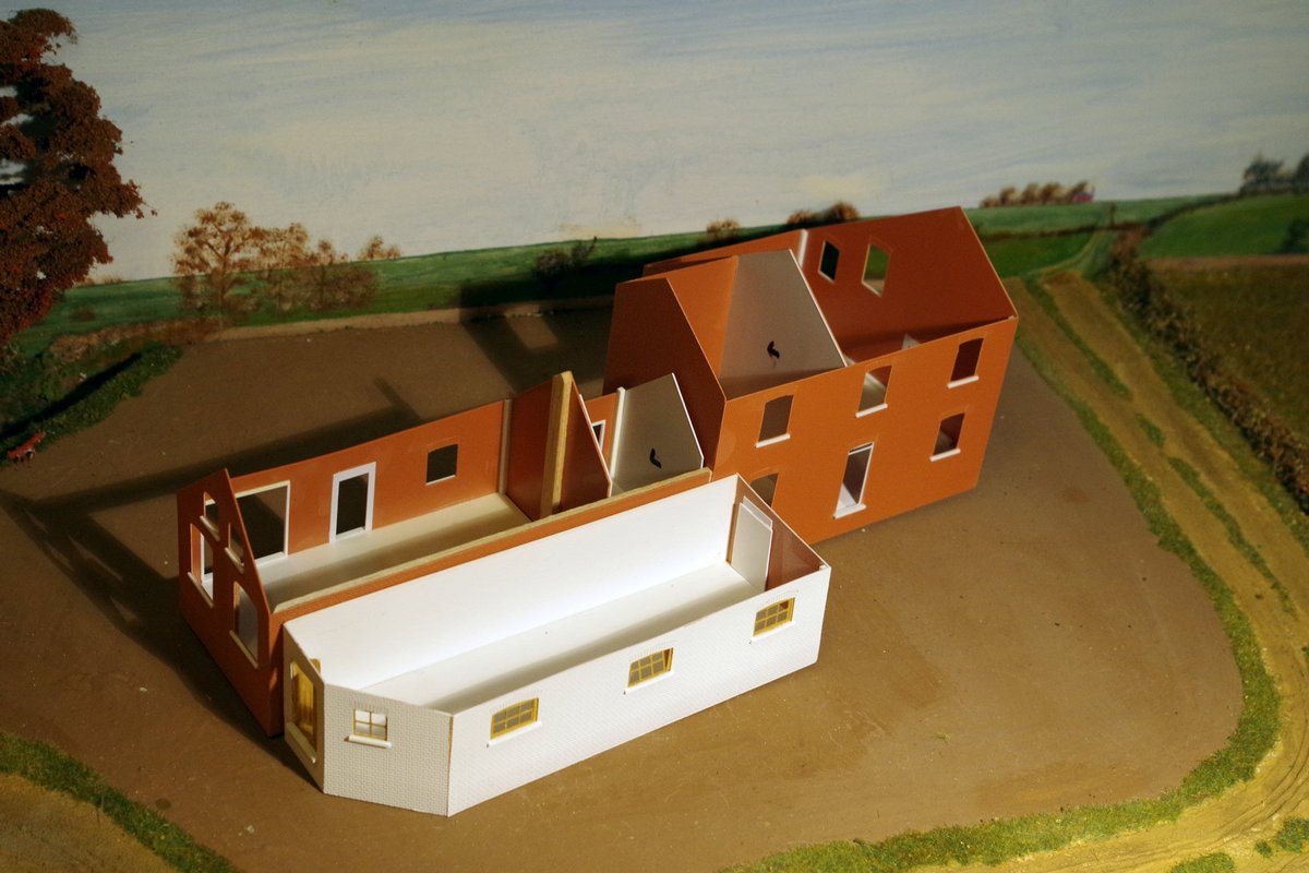 My start point has been to complete the creamery which fills a large scenic gap (photo right). I’ve drawn the building using 3D Turbocad so that I can see what the building will look like before cutting any materials. The mock-up shown above has also helped correct a few minor errors.