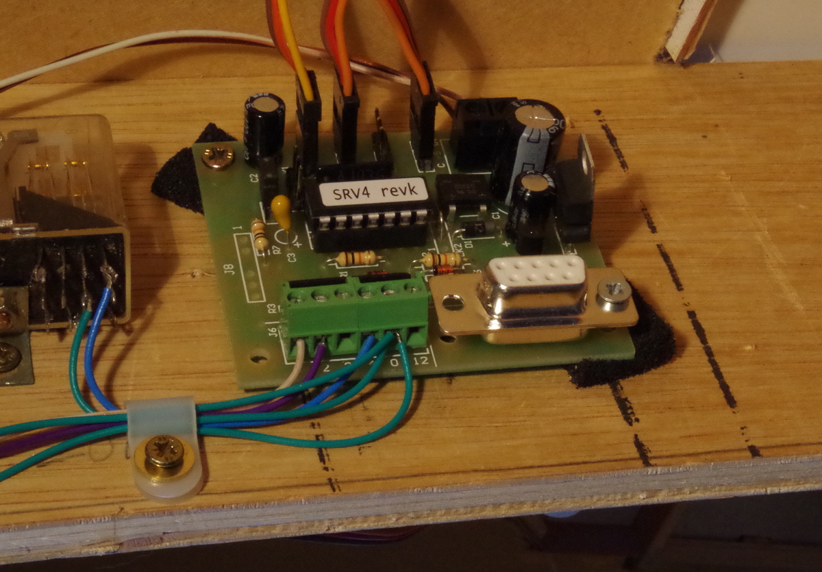 Finally, having got the electronics on the crossing gates working, I have turned my attention to the operation of the rotating ground signals. These have been through two versions so far: Fulgurex motors (too noisy) and Tortoise motors (difficult to adjust for 90 deg rotation). For the baseboard I’m working on, there are three ground signals, so a MERG Servo4 unit is ideal, easy to make and perfect for providing 90 deg rotation. The photo left shows the assembled kit in place under the base-board, with one of the adjacent relays used to close the switch which operates one of the servos. The photo right shows one of the servos fixed in place by a slightly modified MERG servo mount - a useful comparison between the size of a servo, and a Tortoise motor. There is more detail here.