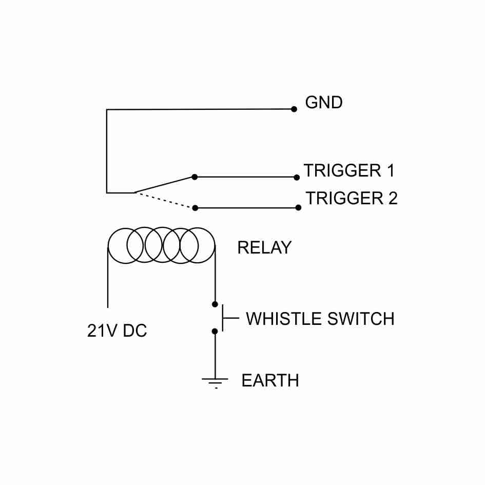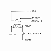 For the sound cards at the north and south crossovers, there are two sound recordings on the card - a five-minute clip of countryside background sounds (birds/sheep/cows etc), and an engine whistle. I have arranged the switching using a relay (diagram right). When not energised, a closed switch on the relay connects trigger 1 to Gnd, which plays the background sounds continuously in a loop. When the ‘whistle’ switch is pressed this energises the relay, which disconnects trigger 1 from Gnd and connects trigger 2 instead, thus playing the whistle recording. When this switch is released, the relay drops out, and reconnects trigger 1, starting the background sounds again.